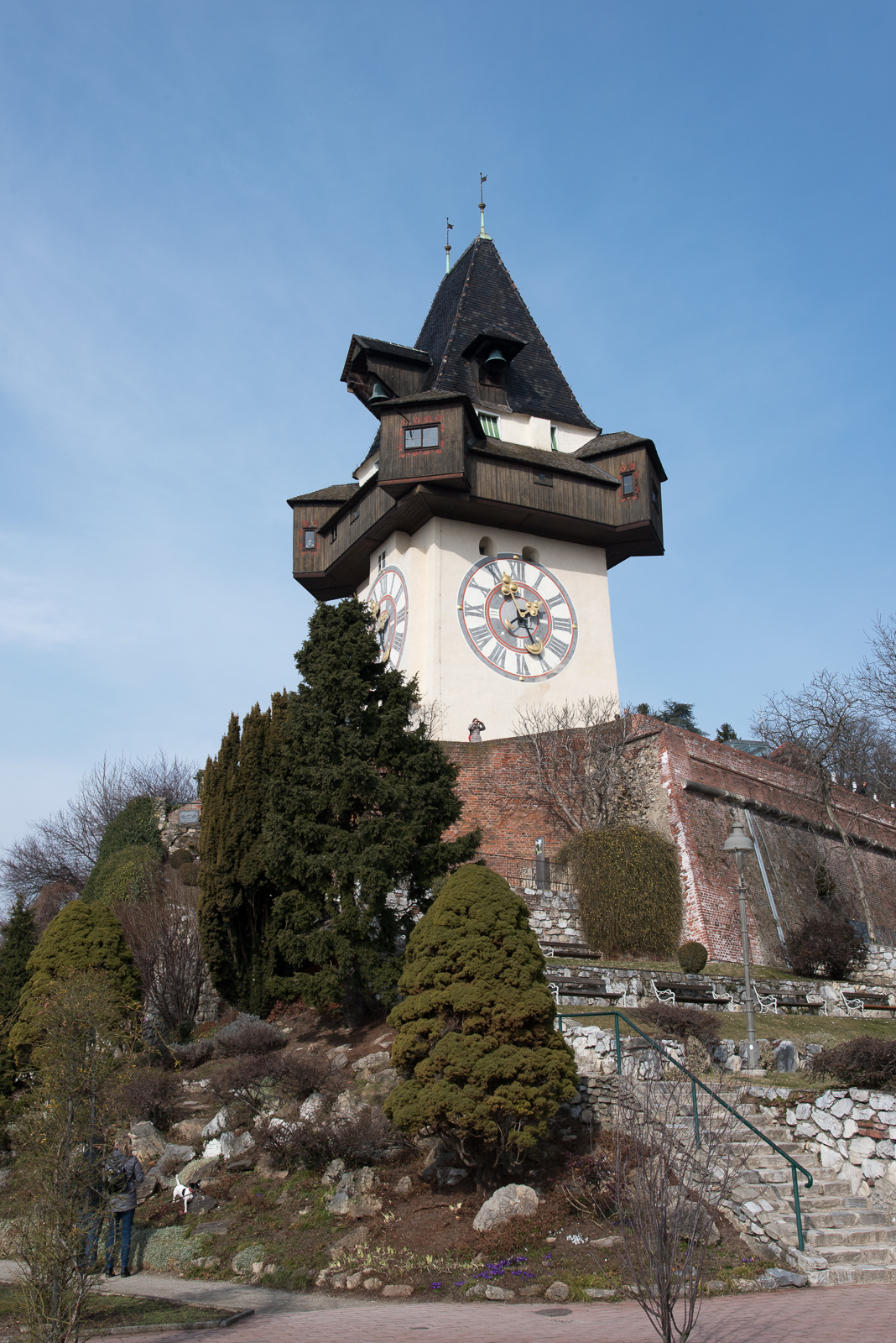 Graz empfing uns am nächsten Tag mit recht frischen Temperaturen, aber die Sonne tat ihr Möglichstes, um den kühlen Dunst aufzulösen. Ab und zu gelang es ihr und es wurde fast schon frühlingshaft. Der Schlossberg präsentierte sich im hellen Morgenlicht und natürlich erklommen wir ihn zu Fuß und verschmähten die Standseilbahn.