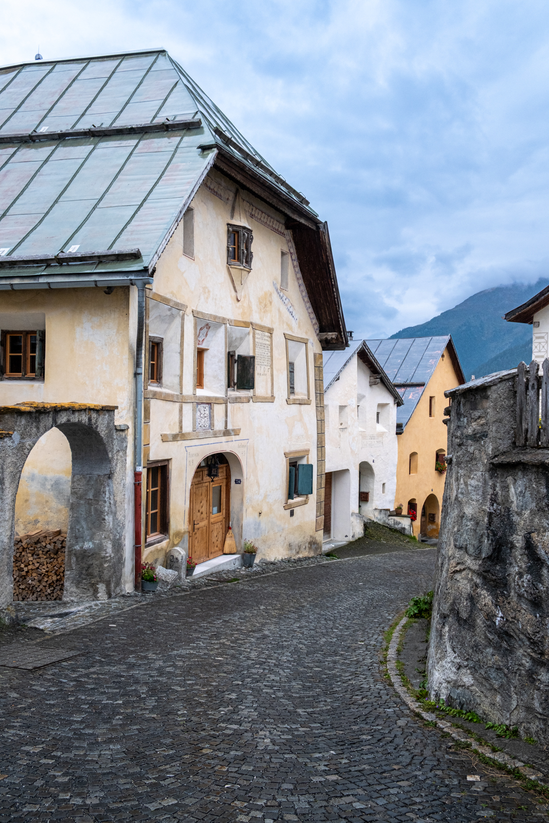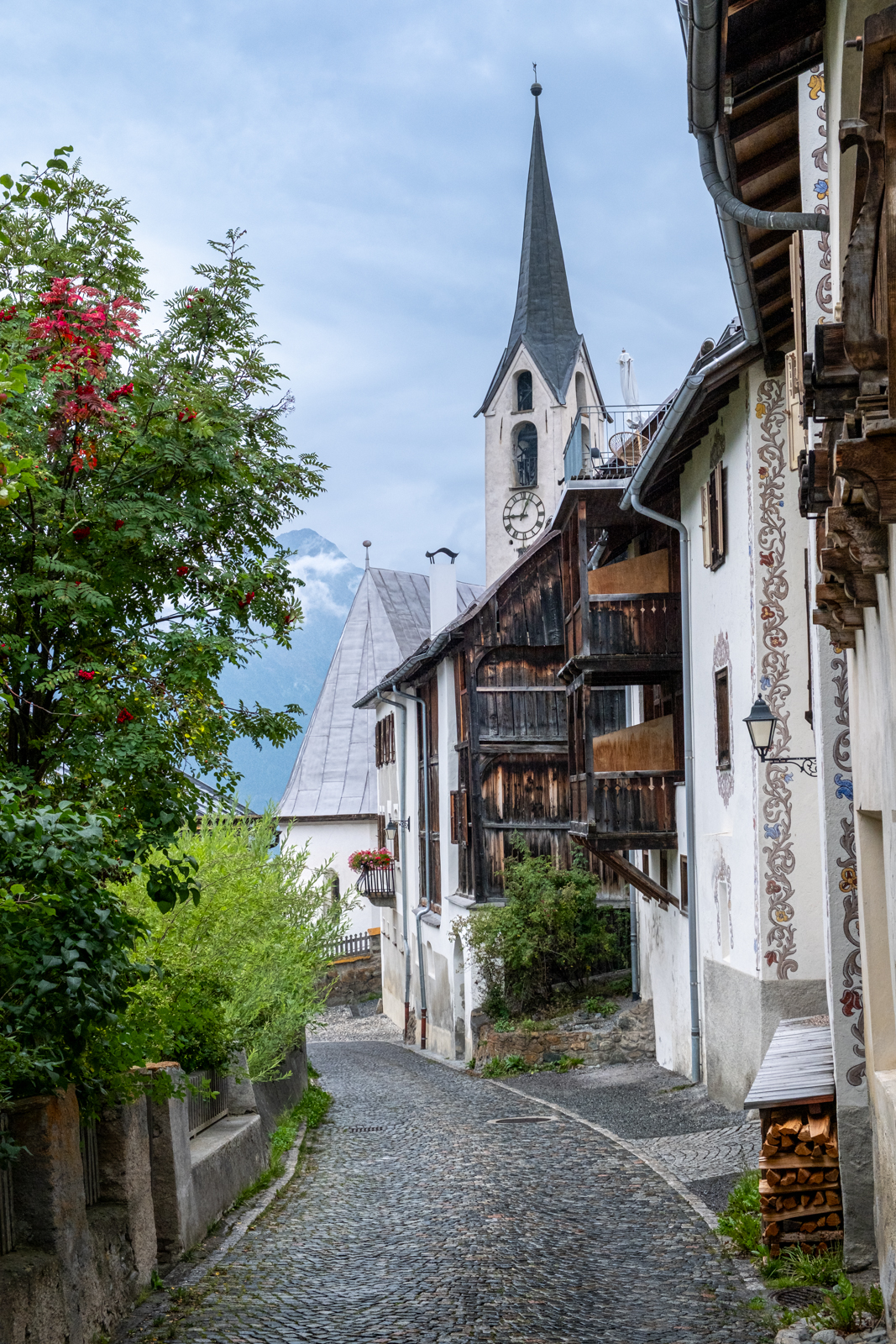 Der letzte Tag war wieder regnerisch. Wir besuchten Guarda, ein “Musterdorf romanischer Kultur und lebendiger Tradition”. Von dort schritten wir weiter bis nach Ardez, im Blick immer das Tal des Inns gesäumt von wolkenverhangenen Bergen.